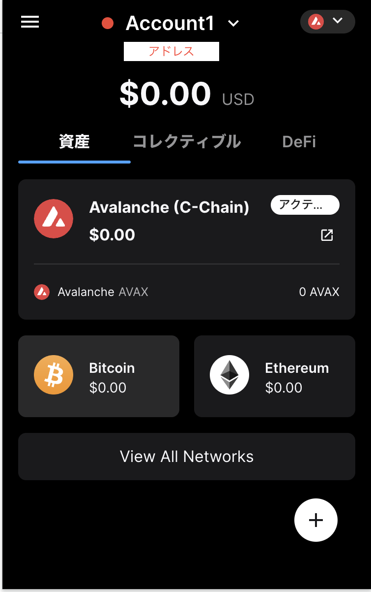 ウォレットでアカウントを作るとアカウントに紐づくアドレスが自動で1つ作成されます。画像の「資産」タブで既存の大手ブロックチェーンの名前ごとに区切られたスペースが表示されていますが、ここには各チェーン上におけるそのアドレスが保有する資産を示しています。