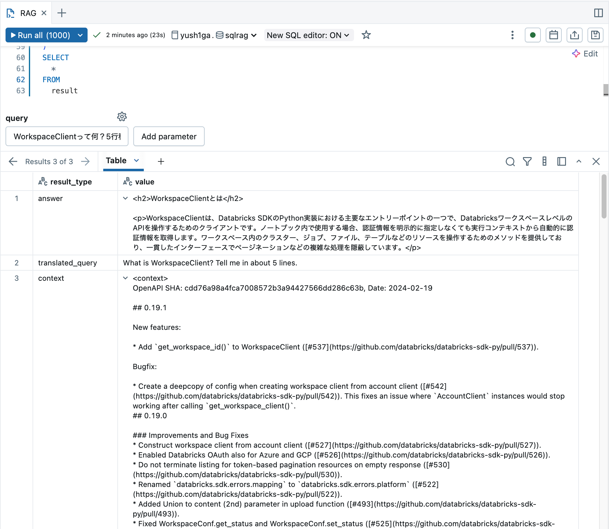 作成した UDF を使って、SQL Warehouse から RAG を実行できます。以下は日本語のクエリを英語に翻訳し、関連するコンテキストを検索して回答を生成する例です。