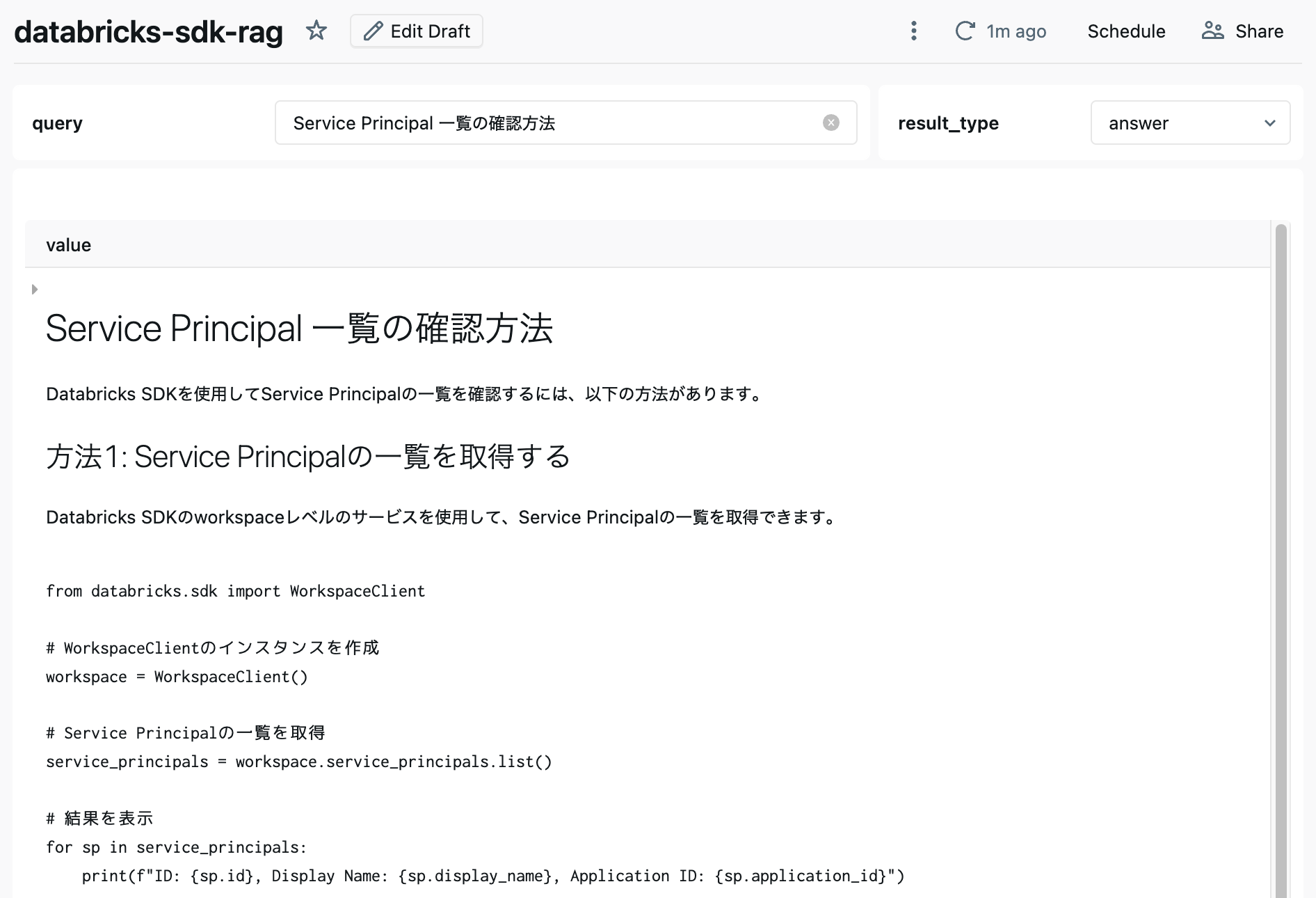 プロダクション環境では、冒頭で紹介した RAG 向けの機能(Vector Search、Model Serving、MLflow、Databricks Apps)の活用を検討してください。