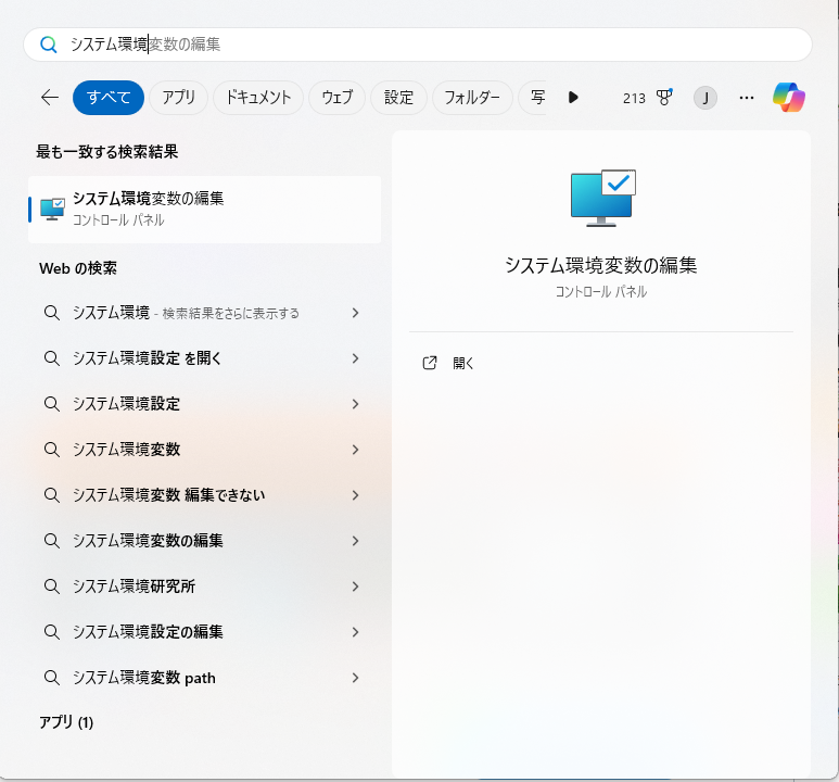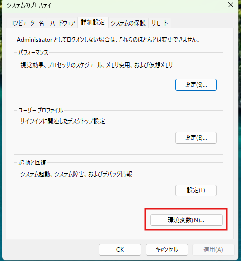 Windowsボタン押して「システム環境変数」と打ち込んでメニュー出す。