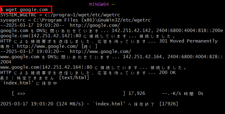今いるフォルダにindex.htmlが生成されてればwget成功。