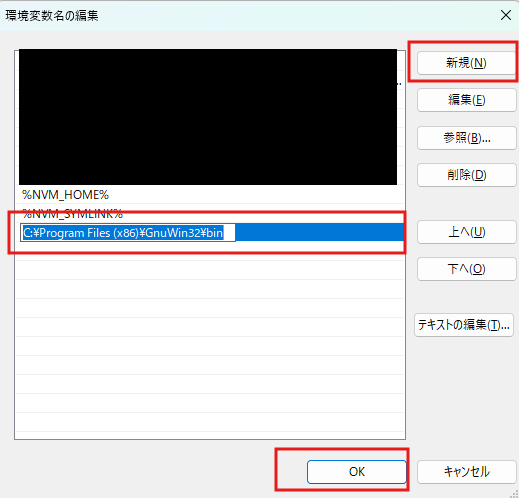 新規ボタンを押して C:\Program Files (x86)\GnuWin32\bin を書き込んで、OK。
