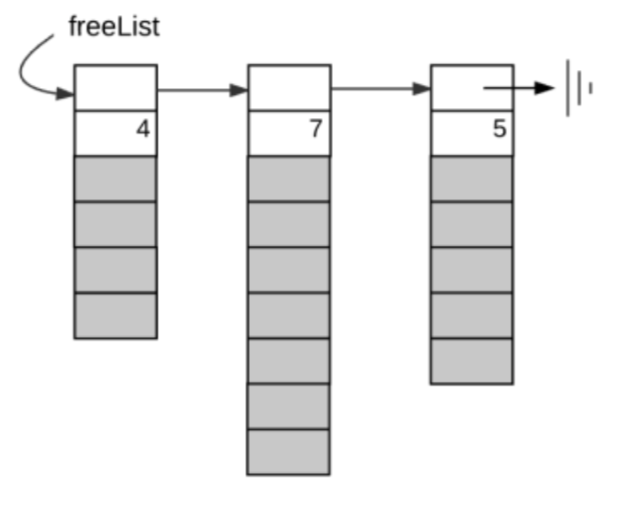 詳しくはテキストを参照して欲しいのですが、簡単にいうとfreeListと呼ぶリストを作成し、セグメントの長さと次のセグメントへのポインタを格納します。そして、あるサイズのメモリブロックの割り当て命令が行われた場合、freeListから適したセグメントを見つけその先頭アドレスを返すといったイメージです。