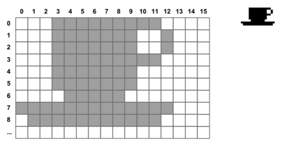 例えば、上のコーヒーカップなら黒を1、白を0とすると各行ごとに