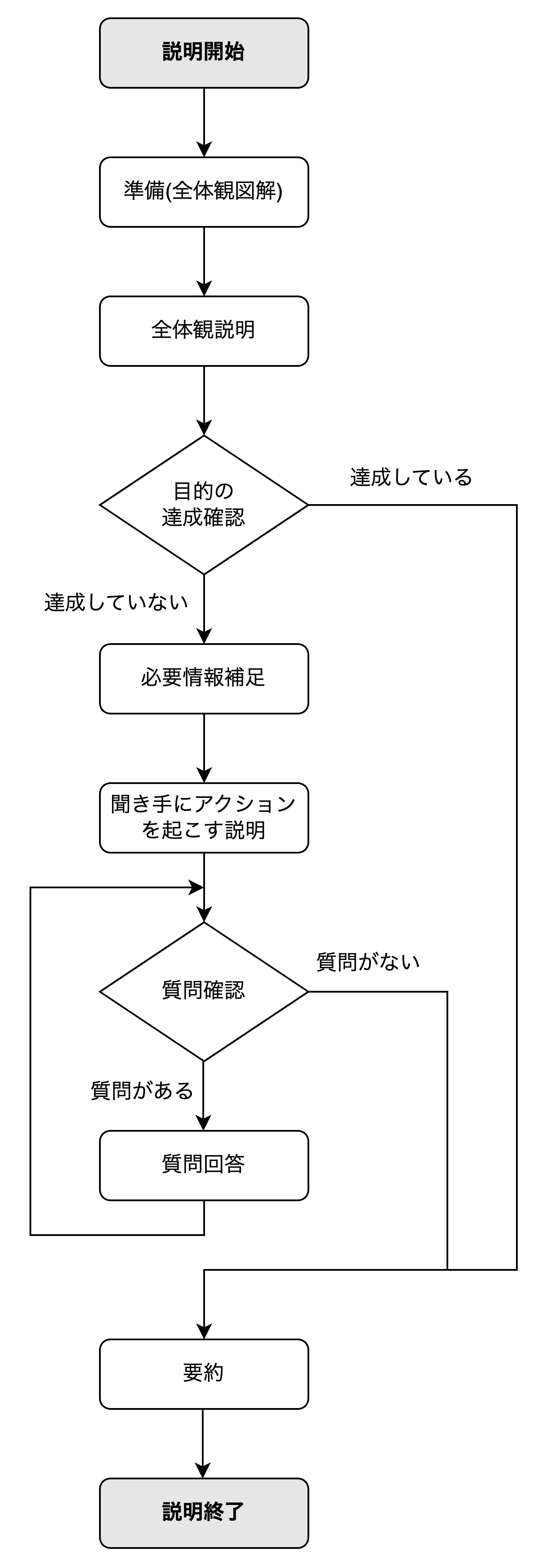 になると思います(これに対応しないことも多々あるとは思います)。もしこの段階で説明の目的を達成していた場合は、詳細な説明を飛ばしてStep3の「締めの説明」に入って良いと思います。もし、説明の目的を果たせていない場合は、引き続きStep2で「詳細の説明」を行います。