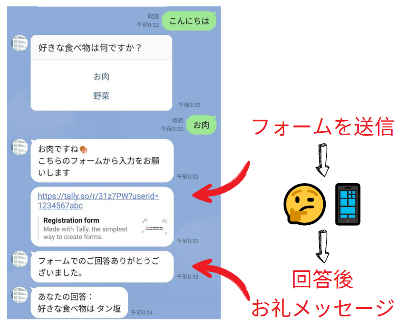 応答メッセージを設定しながら LINE で選択肢のある質問をいくつか送ることで疑似的にフォームのふるまいをしますが、これはメッセージの設計や回答結果の解析が大変なのでやはりフォームを活用したいです。