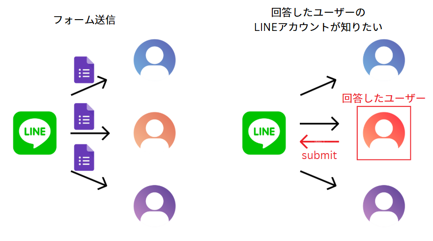 一見、シンプルな機能ですが、フォームの回答完了ボタンをきっかけにして LINE でメッセージを送るため、LINE アカウント側は返信すべきユーザーの情報を保持している必要がある、という訳です。