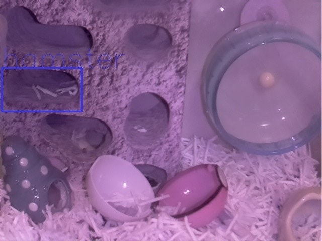 あとは、ハムスター(class=0)の座標値をもとに、検出枠をフレームに描画します。YOLOv5のplot_one_box関数を利用。