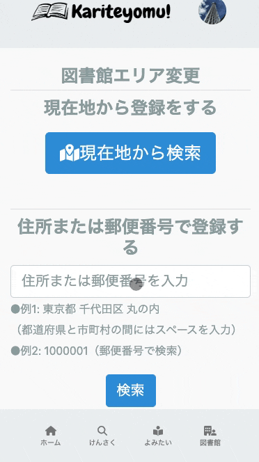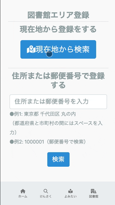 | 現在地付近の図書館エリアを表示して登録 | 住所または郵便番号を入力して登録 |