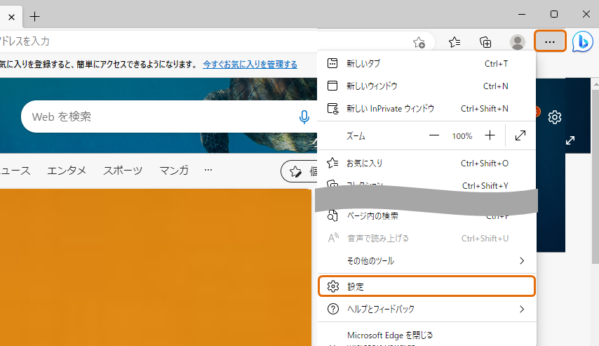 ①Edge右上の三点リーダー「・・・」をクリックし、「設定」をクリック。