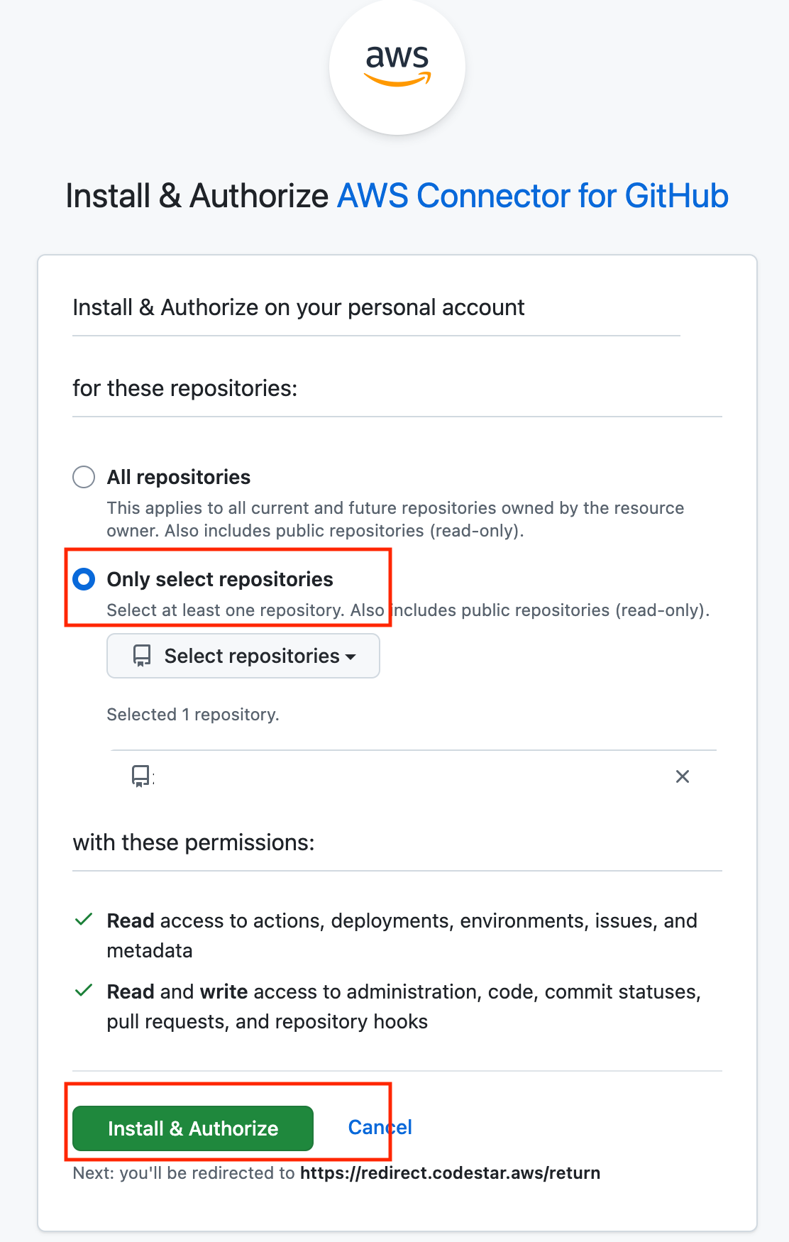 「Only select repositories」を選択し、「install & Authorize」をクリックします