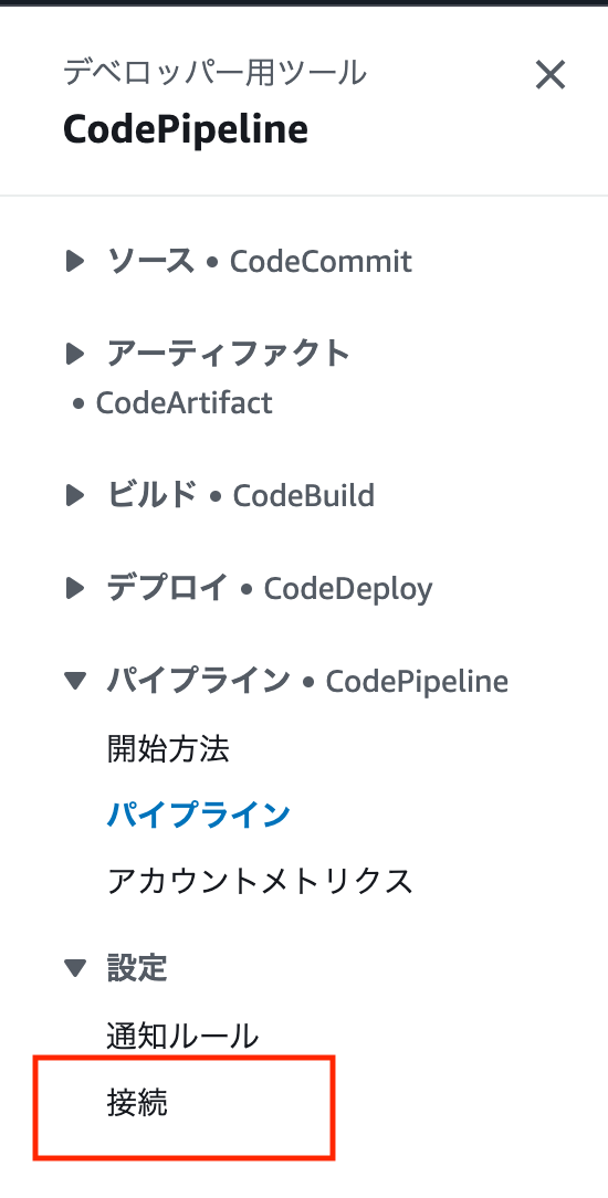 | Connectionとは | 接続を使用して、サードパーティープロバイダーのリソースを次のデベロッパーツールの AWS リソースと統合できる サードパーティプロバイダーに接続し、CodePipelineなどのAWSリソースとの接続ができる |