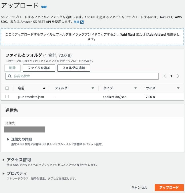 Glueジョブを作成するにあたり、S3バケットとテストデータを準備します。