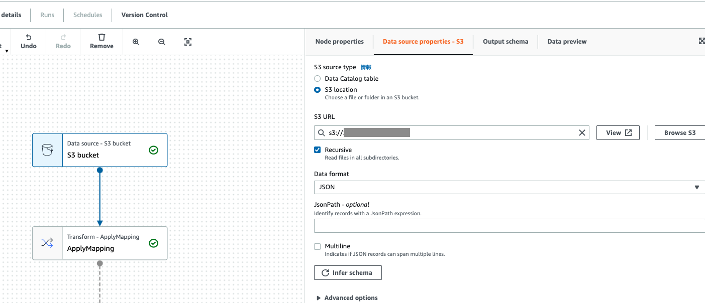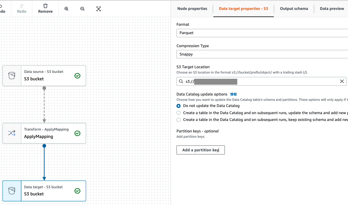 "codeGenConfigurationNodes" : "{\"node-1\":{\"S3JsonSource\":{\"AdditionalOptions\":{\"EnableSamplePath\":false,\"SamplePath\":\"s3://インプットデータ格納用バケット/glue-testdata.json\"},\"Exclusions\":[],\"JsonPath\":\"\",\"Multiline\":false,\"Name\":\"S3 bucket\",\"OutputSchemas\":[{\"Columns\":[{\"Name\":\"id\",\"Type\":\"string\"},{\"Name\":\"value\",\"Type\":\"string\"}]}],\"Paths\":[\"s3://インプットデータ格納用バケット\"],\"Recurse\":true}},\"node-2\":{\"ApplyMapping\":{\"Inputs\":[\"node-1\"],\"Mapping\":[{\"Dropped\":false,\"FromPath\":[\"id\"],\"FromType\":\"string\",\"ToKey\":\"id\",\"ToType\":\"string\"},{\"Dropped\":false,\"FromPath\":[\"value\"],\"FromType\":\"string\",\"ToKey\":\"value\",\"ToType\":\"string\"}],\"Name\":\"ApplyMapping\"}},\"node-3\":{\"S3GlueParquetTarget\":{\"Compression\":\"snappy\",\"Inputs\":[\"node-2\"],\"Name\":\"S3 bucket\",\"PartitionKeys\":[],\"Path\":\"s3://アウトプットデータ格納用バケット\",\"SchemaChangePolicy\":{\"EnableUpdateCatalog\":false,\"UpdateBehavior\":\"UPDATE_IN_DATABASE\"}}}}",
