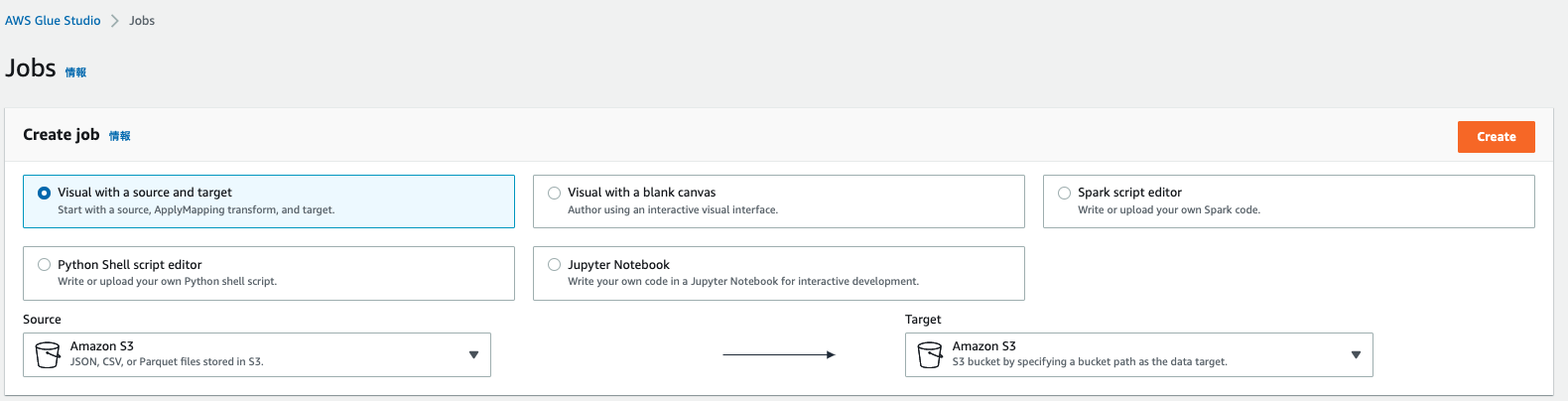 1.Glue Studioのトップページで以下を選択し、「Create」をクリックします。