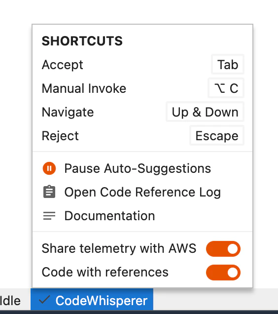 { "Version": "2012-10-17", "Statement": [ { "Sid": "CodeWhispererPermissions", "Effect": "Allow", "Action": [ "codewhisperer:GenerateRecommendations" ], "Resource": "*" } ] } -