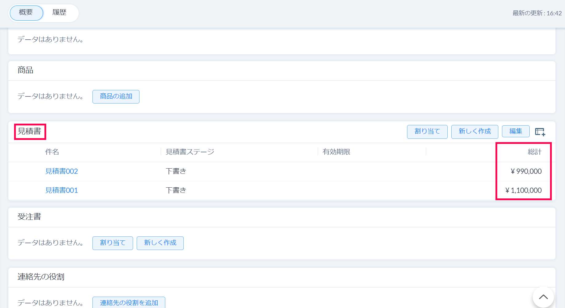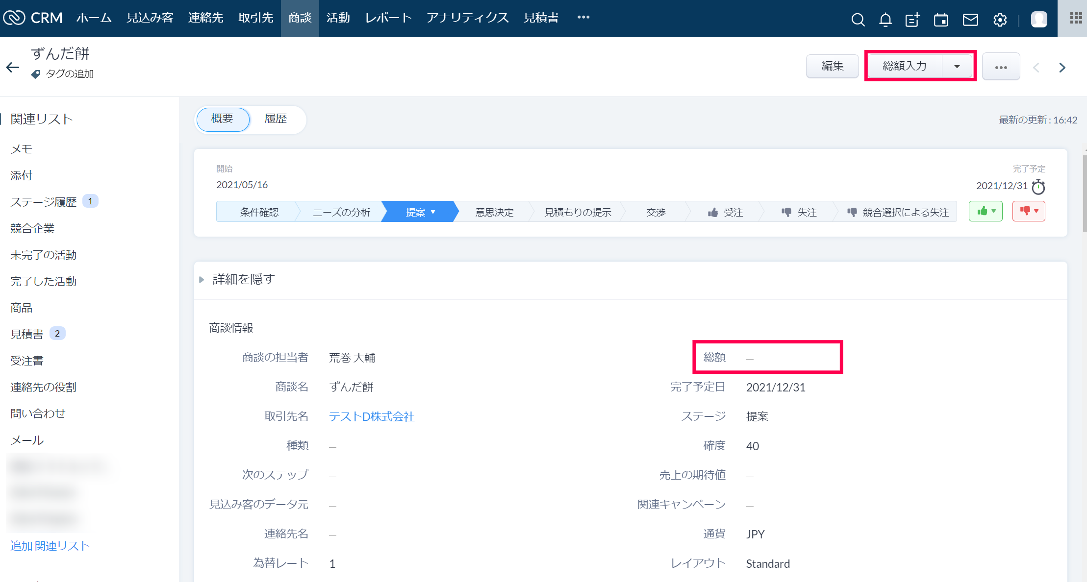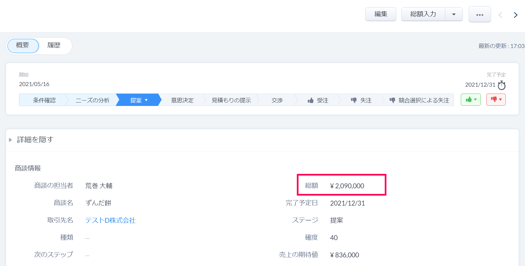 商談の各データ内の[総額入力]ボタンをクリックすると、[総額]項目に関連付けられている見積書の総計を入力する方法を紹介します。